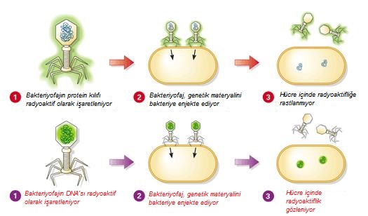 Protein kılıfı radyoaktif kükürt, DNA’sı ise radyoaktif fosfor ile işaretlenen fajların E. Coli hücrelerini enfekte etmesi sağlanmış, daha sonra fajlar ve bakteriler birbirlerinden ayrılmıştır.