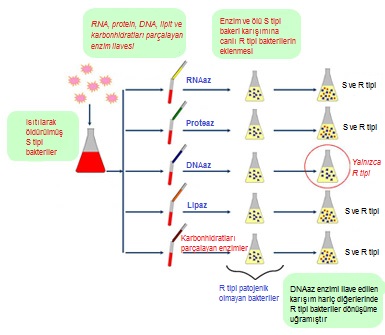 Oswald AVERY ve arkadaşları, Griffith’in deneylerinde kullandığı patojen S tipi bakterileri ısıtarak öldürmüş ve ardından bakterinin yapısını oluşturan değişik kimyasal madde gruplarını saflaştırmıştır.